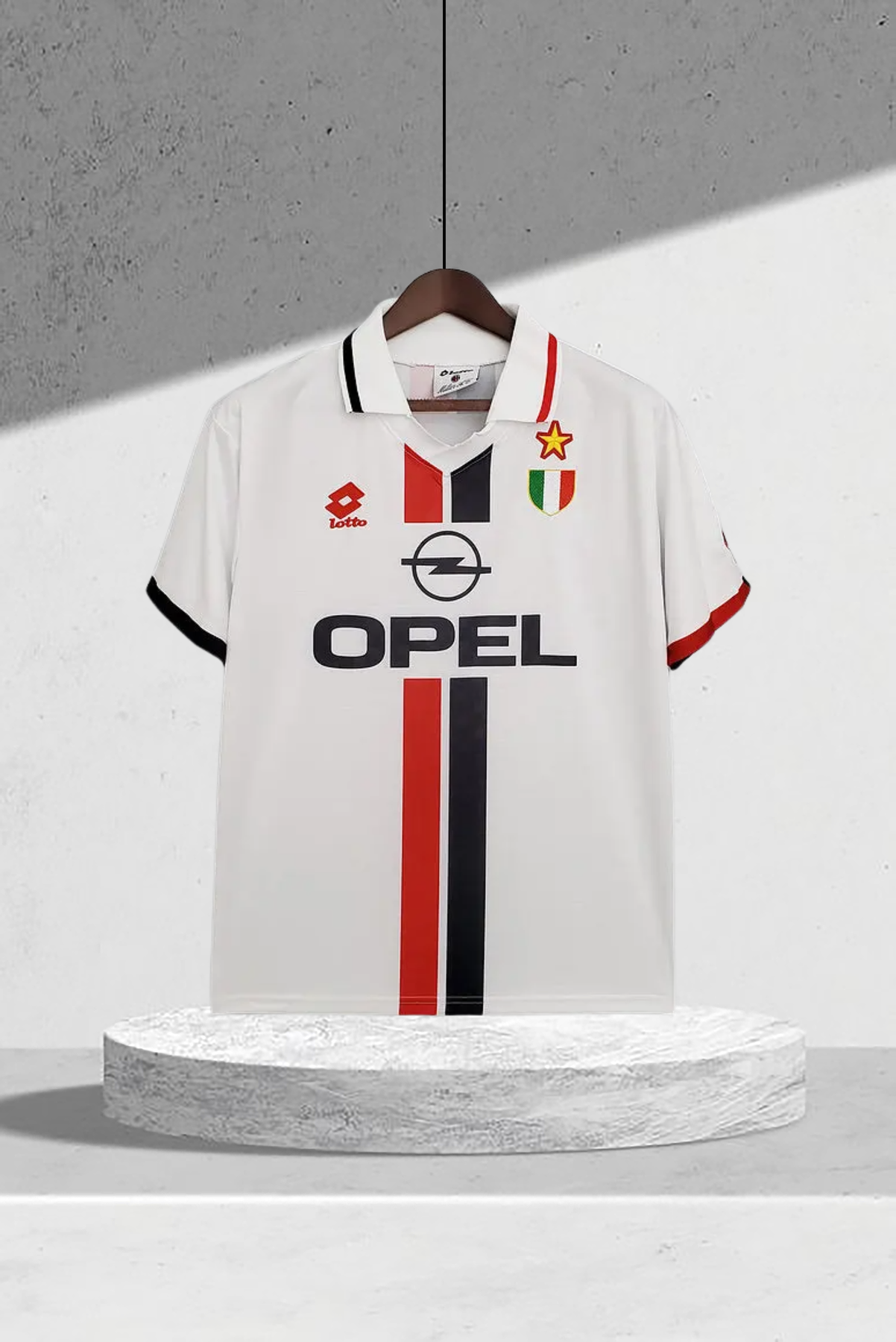 Erlebe die Geschichte des AC Milan mit dem legendären Auswärtstrikot 1995–1997. In zeitlosem Weiß, Rot und Schwarz präsentiert sich dieses Trikot als ein Klassiker des Fußballs.
