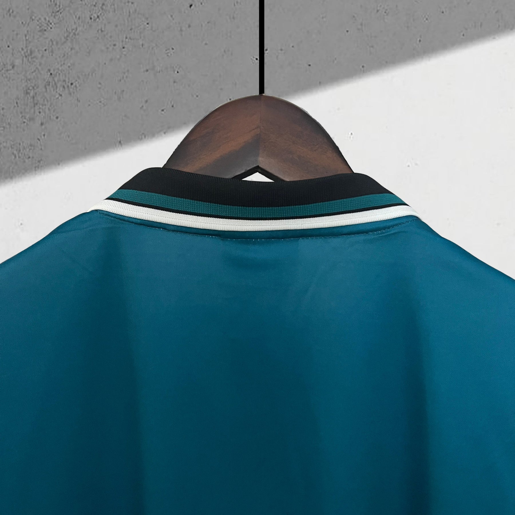 • Kragen: Breiter schwarzer Polokragen mit weißem Streifen und Knopfleiste – klassisch, markant und stilvoll.
