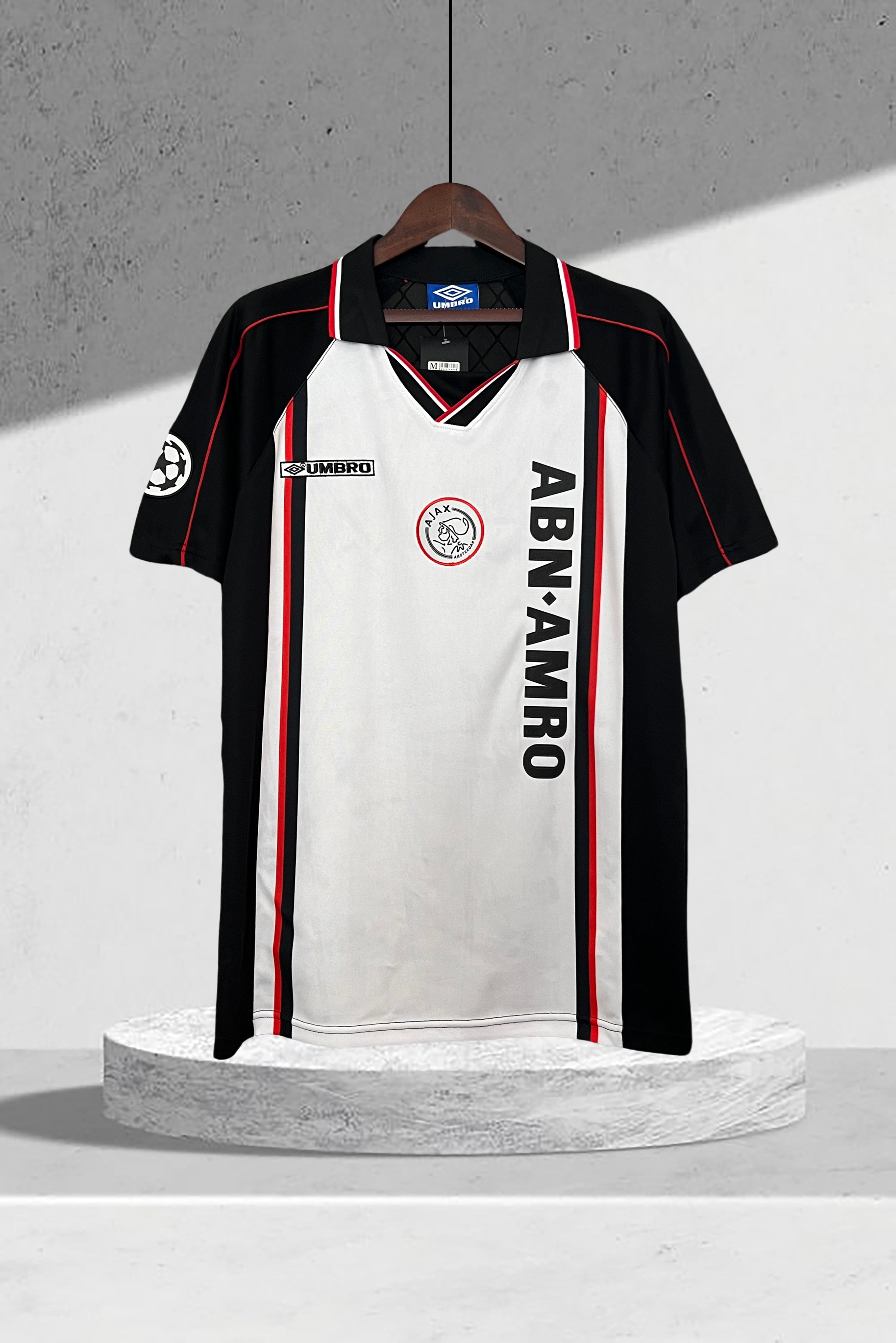 • Logos und Aufdrucke: Gesticktes Ajax-Wappen mit drei Sternen und vertikaler Sponsorschriftzug in Weiß – markantes Merkmal der Ajax-Trikots der 90er.