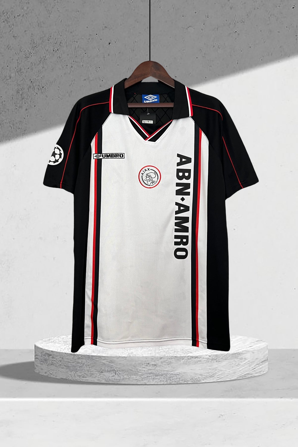 • Logos und Aufdrucke: Gesticktes Ajax-Wappen mit drei Sternen sowie vertikaler weißer Sponsorschriftzug – zentral platziert, als typisches Merkmal der Ajax-Trikots der 90er.