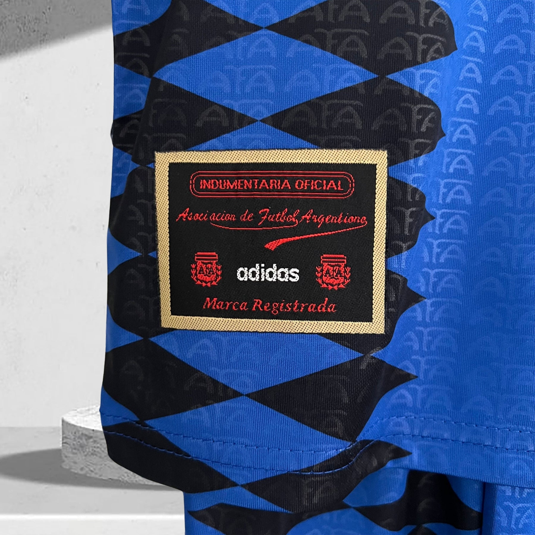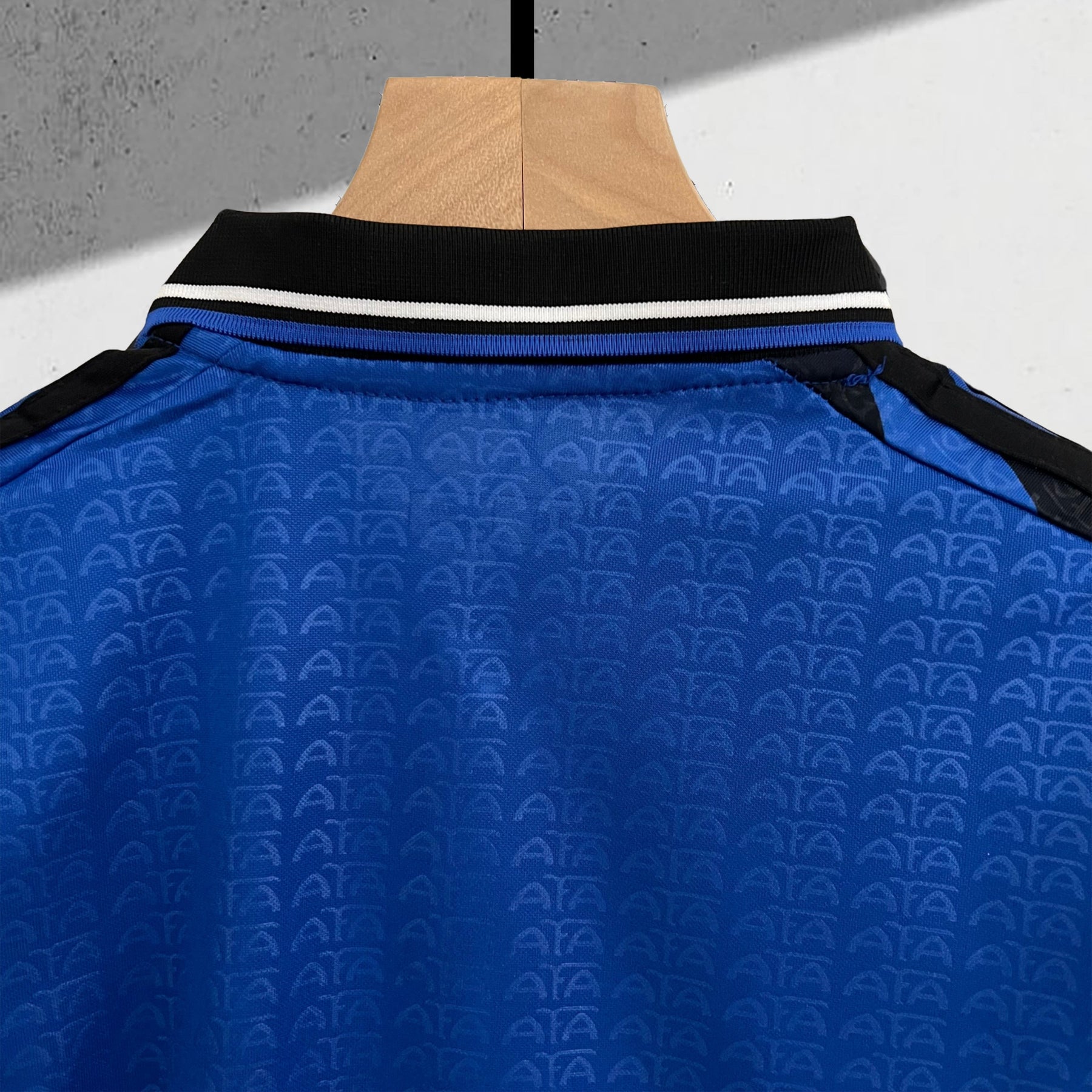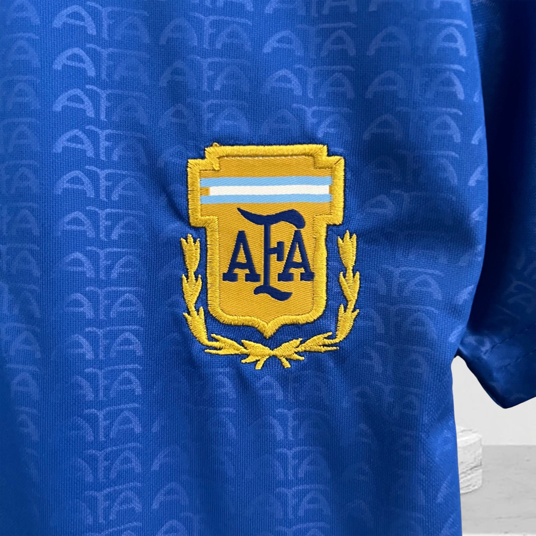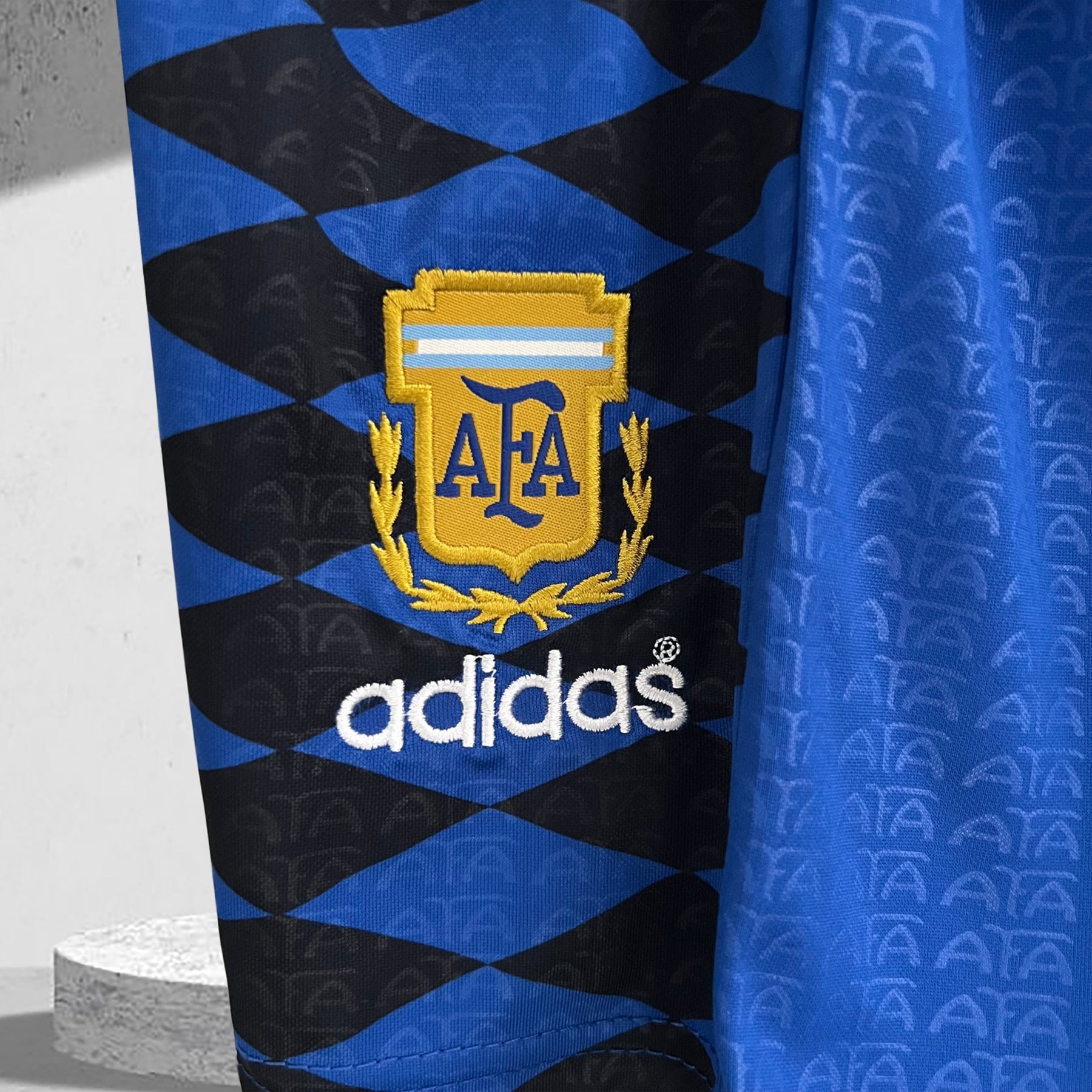 • Details: Ton-in-Ton-Diagonalstreifen und gesticktes AFA-Wappen in Gold und Himmelblau.