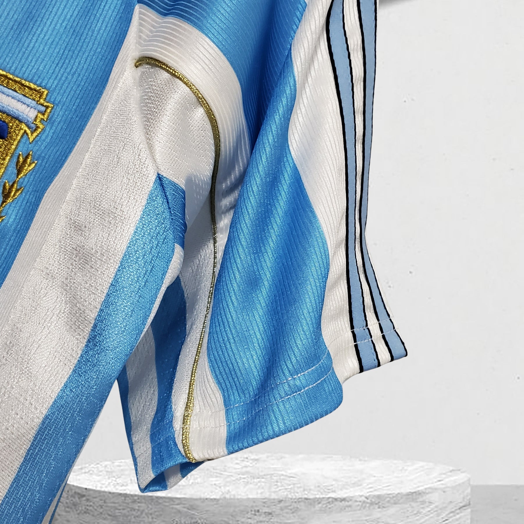 Entdecke das legendäre Argentinien 1998 Heimtrikot – ein Symbol für Stolz und Tradition. Mit seinen breiten himmelblauen Streifen auf einer weißen Basis verkörpert es den unvergleichlichen 90er-Jahre-Flair. Geprägt von schwarzen Akzenten und einem eleganten Polokragen, ist dieses Trikot ein Must-Have für echte Fußballfans.