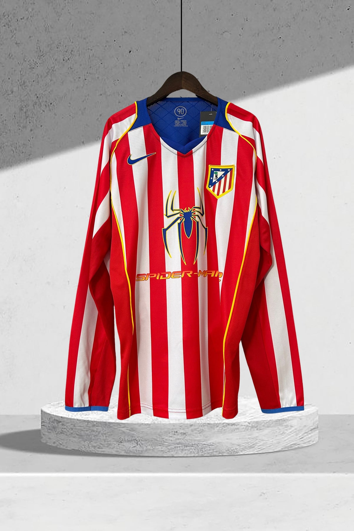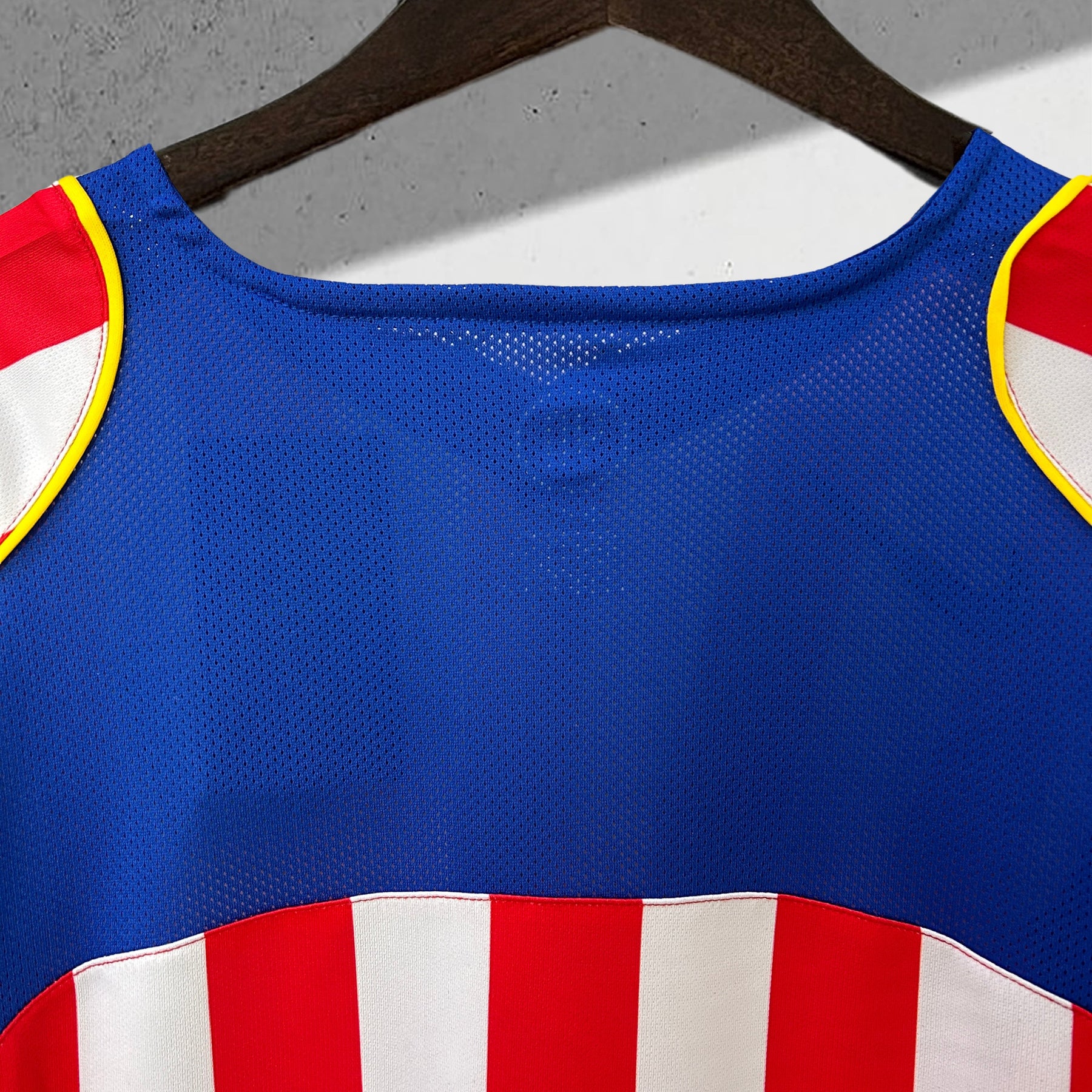 Entdecke das Atlético Madrid Heimtrikot aus der Saison 2004–2005 – eine gelungene Verbindung aus Tradition und modernem Design. Mit vertikalen roten und weißen Streifen, einem eleganten runden Kragen und stilvollen blauen Akzenten bringt es die Leidenschaft des Clubs perfekt zur Geltung.