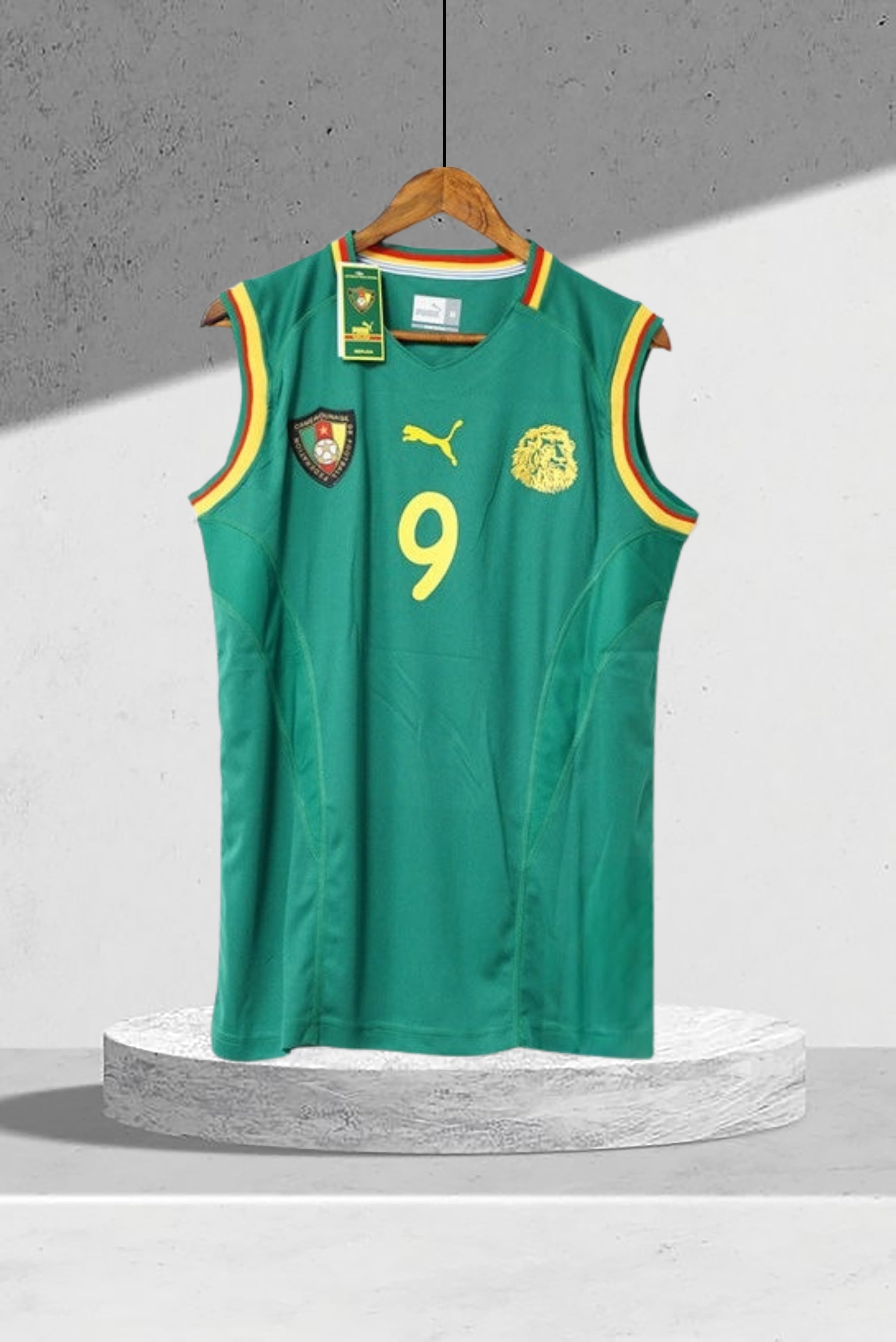 Das Kamerun 1998 WM Heimtrikot ist eine Hommage an die stolze Tradition des afrikanischen Fußballs. In kräftigem Grün mit gelben und roten Akzenten verkörpert es den Geist der „Unbezähmbaren Löwen“.