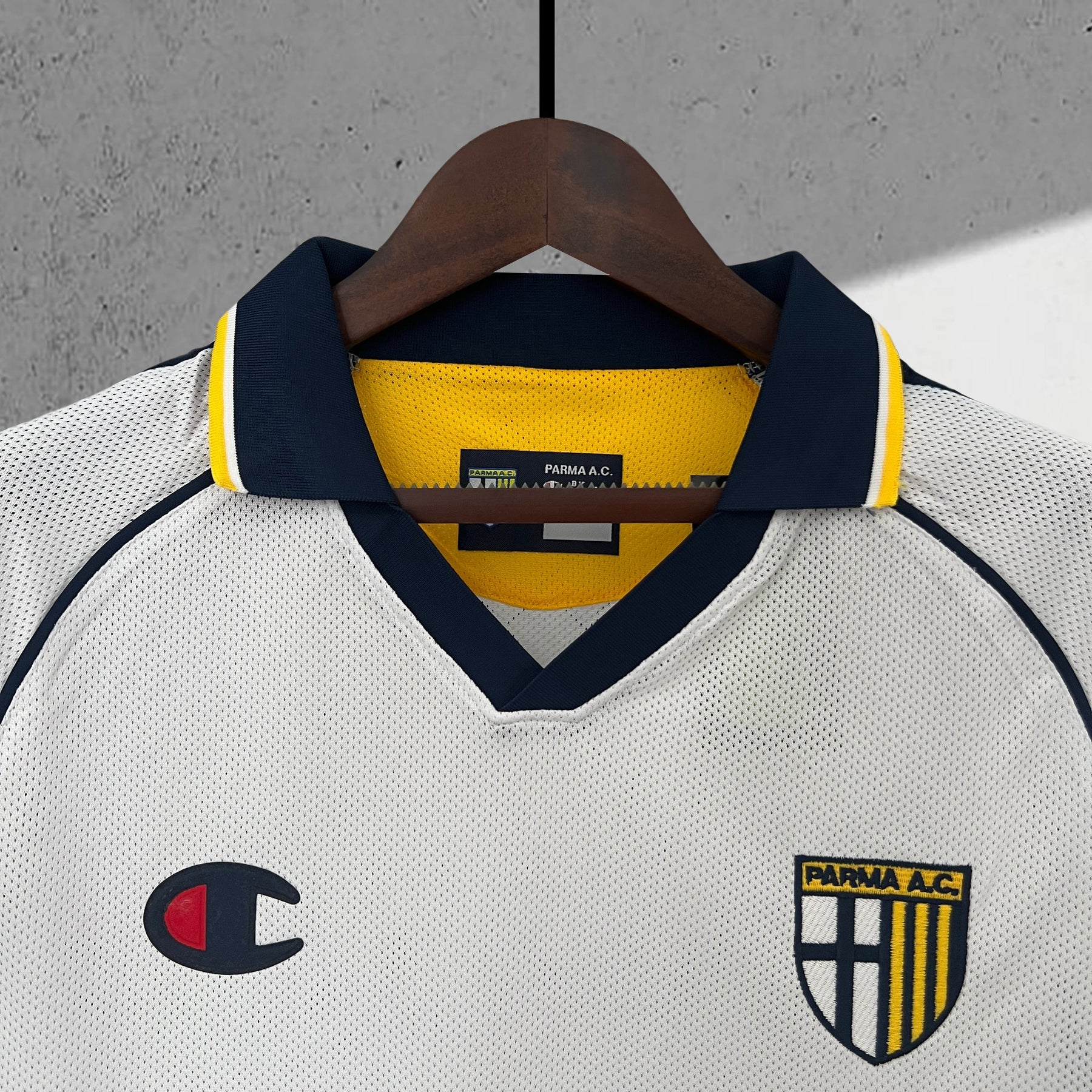 • Details: Großes schwarzes Kreuz auf der Brust – ein direktes visuelles Echo auf das Stadtwappen von Parma und die Vereinsästhetik der 90er