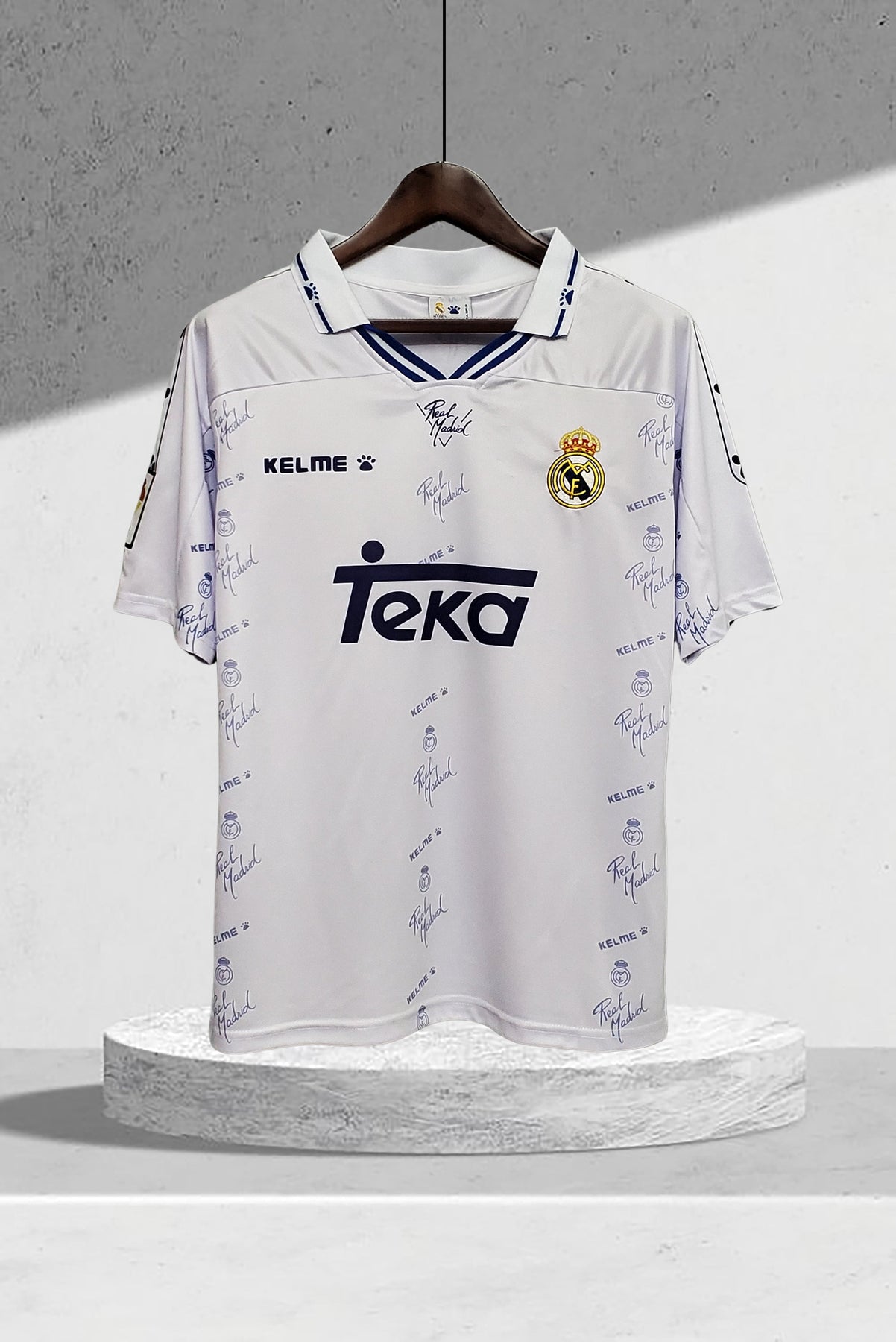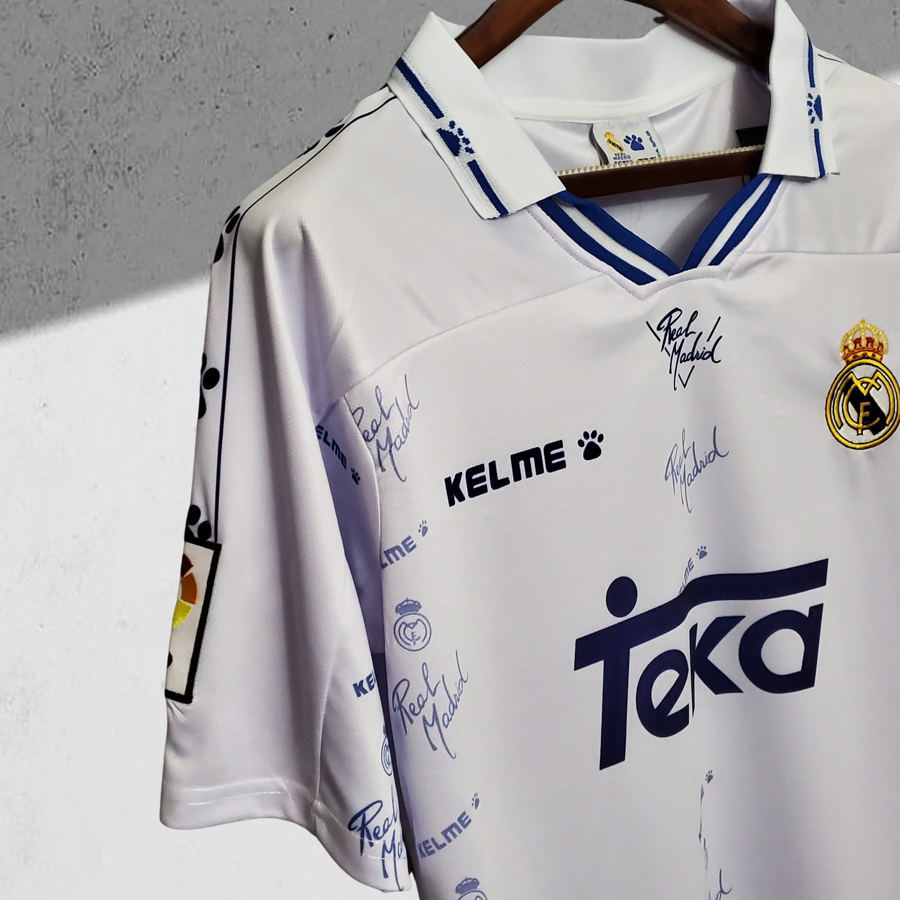 Entdecke das Real Madrid 1995–1996 Heimtrikot – ein zeitloses Stück Fußballgeschichte. In klassischem Weiß mit lila und dunkelblauen Grafiken verkörpert es den stilvollen 90er-Jahre-Look. Trage die Farben von Legenden wie Raúl González und Fernando Hierro, die in einer entscheidenden Übergangssaison für den Klub spielten. Perfekt für Sammler und Fußballfans, die den charaktervollen Stil und die königliche Identität schätzen. Hol dir dieses ikonische Trikot und fühle den Geist des Estadio Santiago Bernabéu!