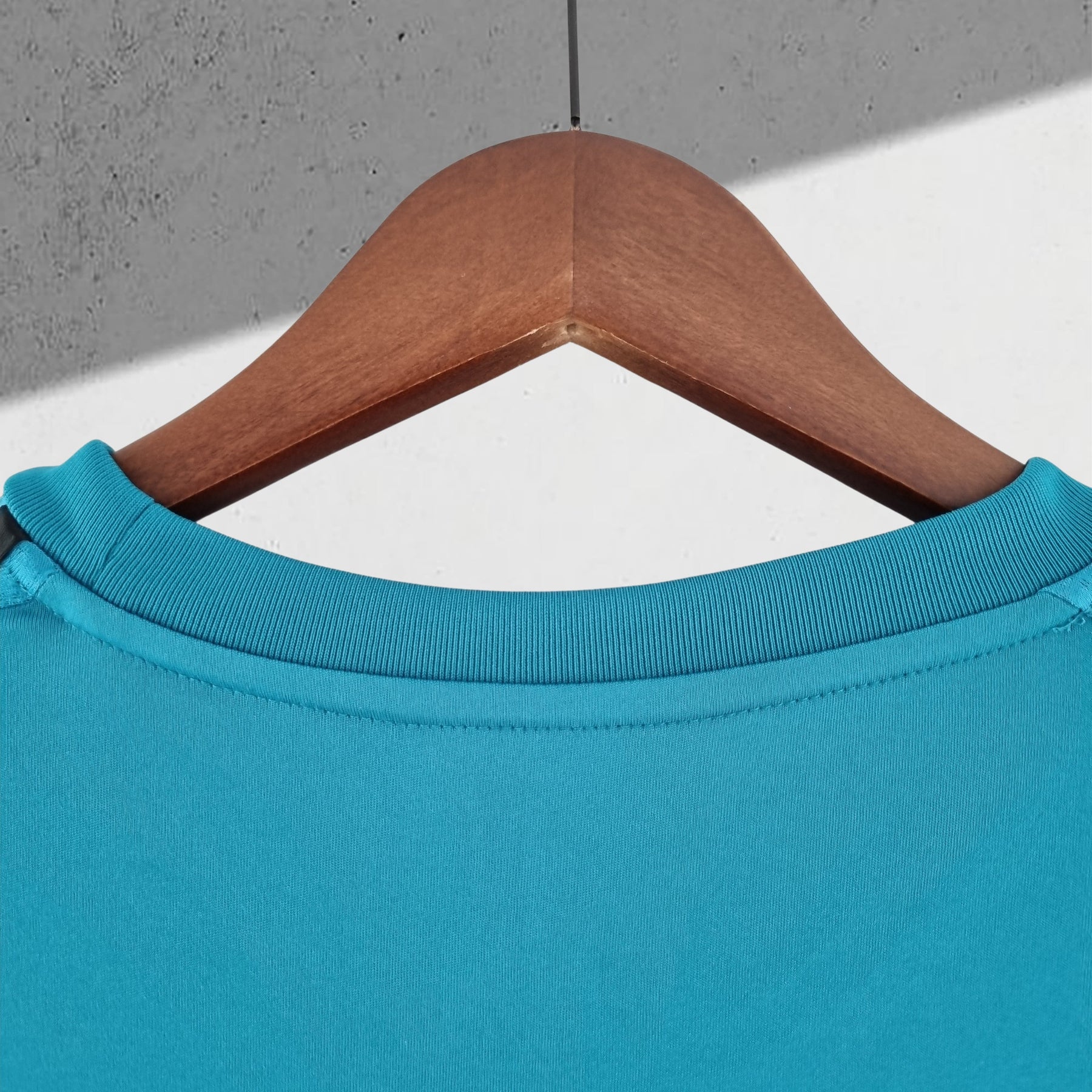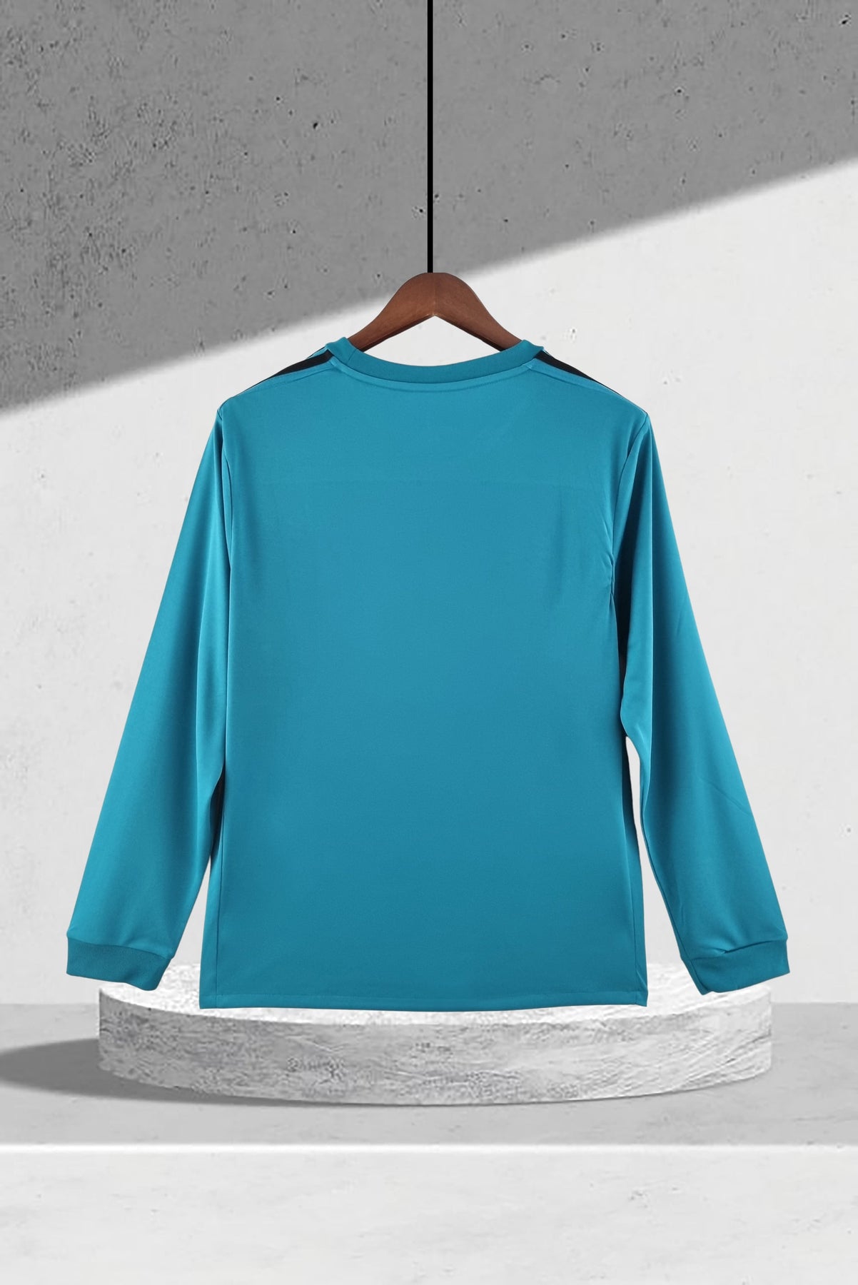 Entdecke das Real Madrid 2017–2018 3. Langarmtrikot – ein wahres Must-have für alle Fußballfans. Dieses auffällige türkisblaue Design erinnert an die glorreiche Champions-League-Saison, in der Real Madrid die Trophäe zum dritten Mal in Folge gewann.