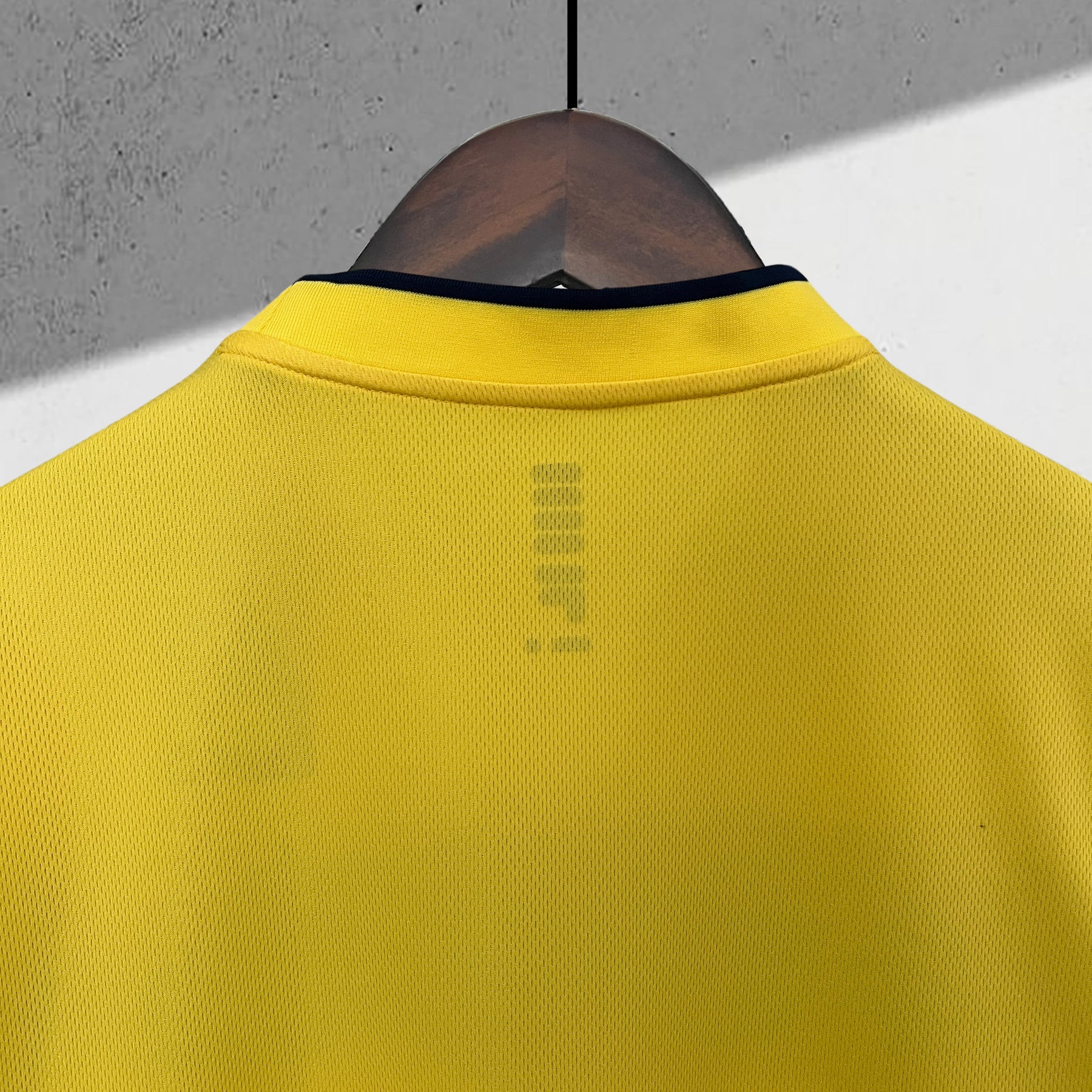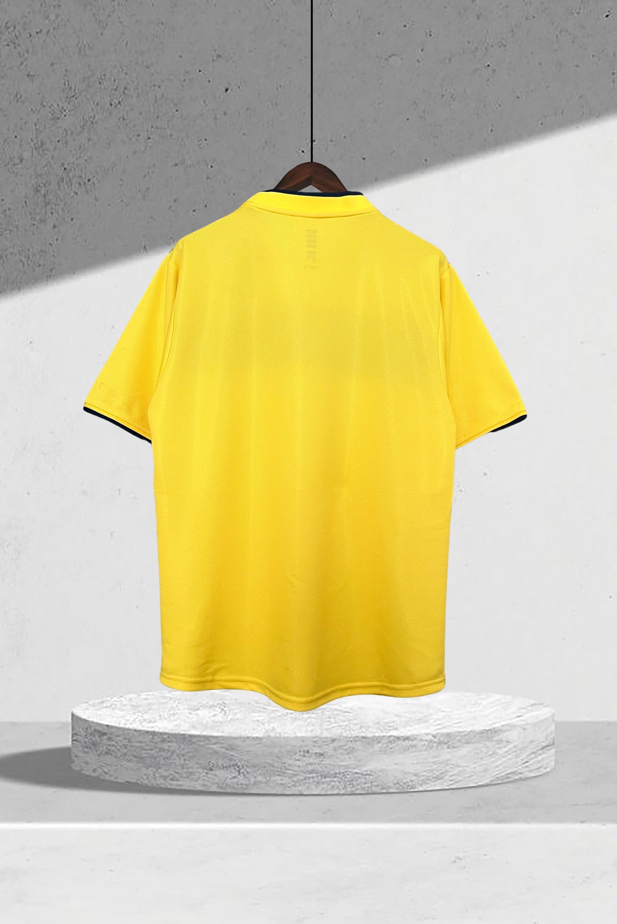 Das Auswärtstrikot Schottlands aus dem Jahr 2002 ist ein seltenes Juwel in der Geschichte der Nationalmannschaft – ein Trikot, das mit Konventionen bricht und sich zu etwas ganz Eigenem bekennt. Mit seiner metallisch-goldenen Farbgebung und der marineblauen Bruststreifen ist es zugleich mutig und würdevoll – ein visuelles Statement für Stolz, Wille und schottische Identität mit königlicher Stärke.