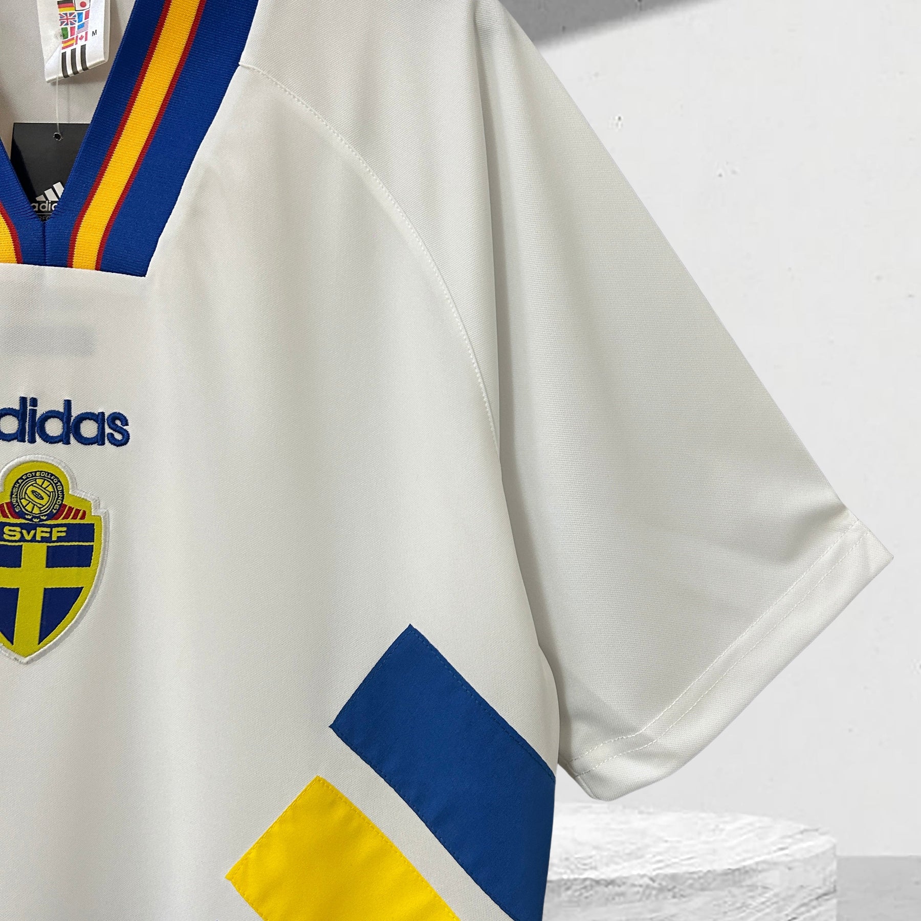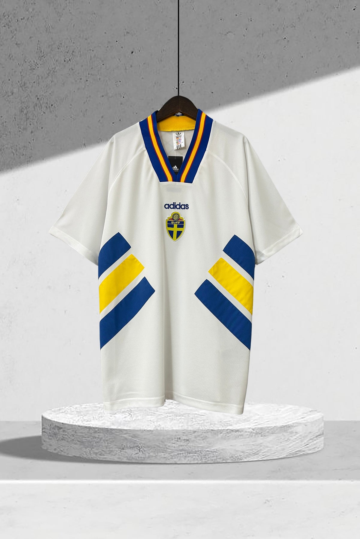 Erlebe die Kraft und den Stolz des Schweden 1994 WM Auswärtstrikots – ein Symbol für Entschlossenheit und Teamgeist. In dunklem Königsblau mit markanten gelben Details strahlt es Stärke aus und reflektiert die Dynamik des schwedischen Nationalteams.