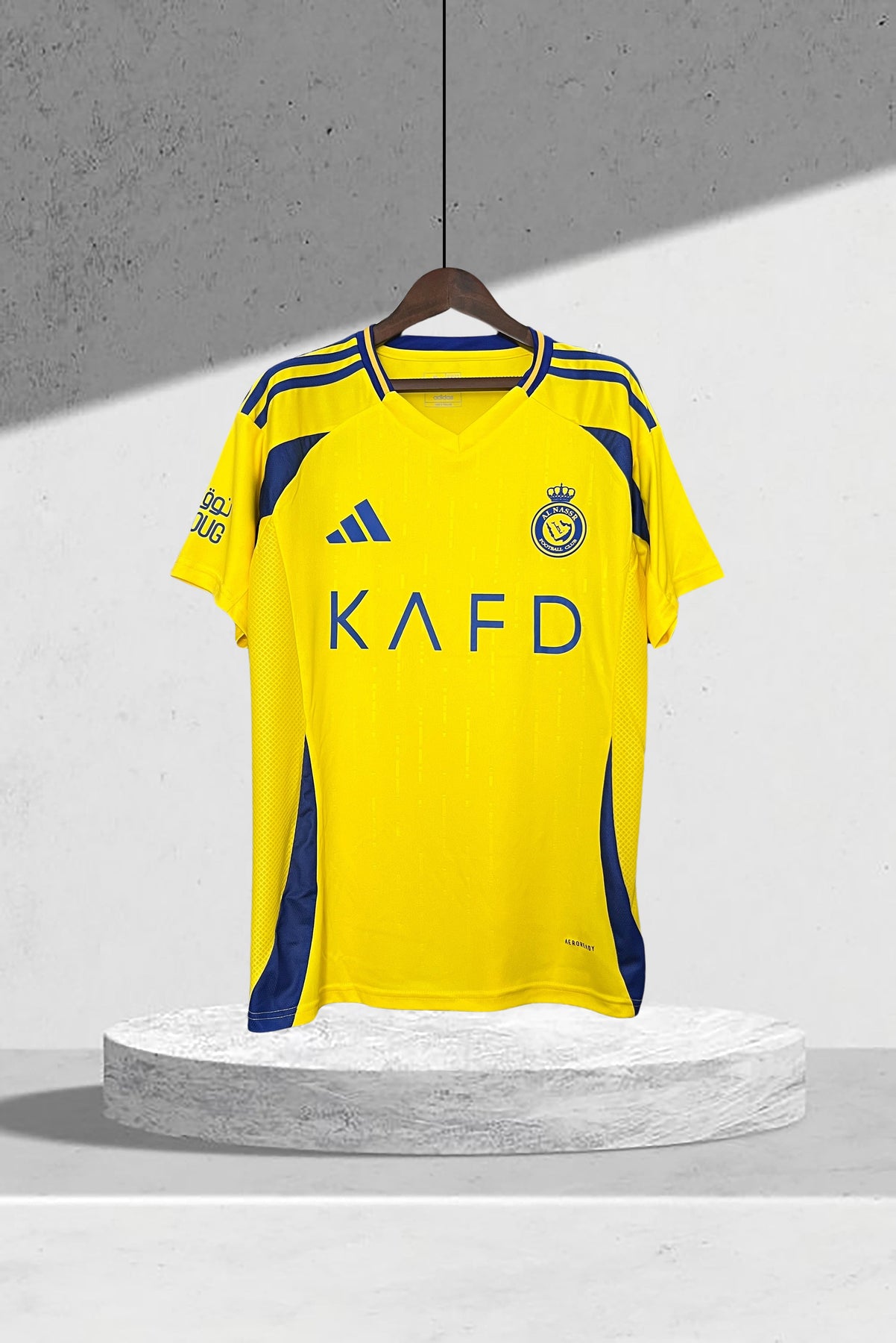 • Details: Blaue vertikale Elemente und grafische Muster, inspiriert von den Linien Riyadhs und Al Nassrs Zukunftsvision.