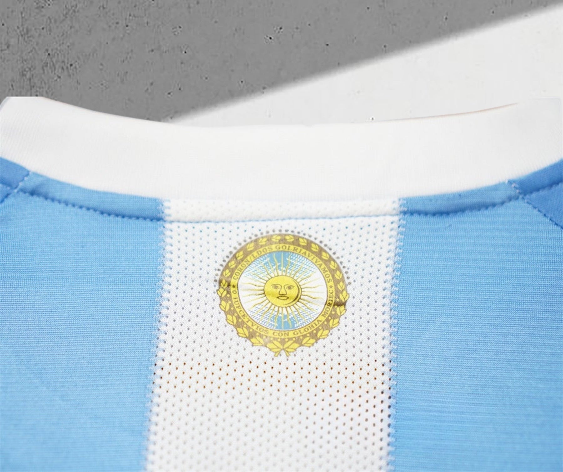 • Grundfarbe: Weiß mit breiten, himmelblauen Vertikalstreifen – treu dem klassischen Argentinien-Stil.