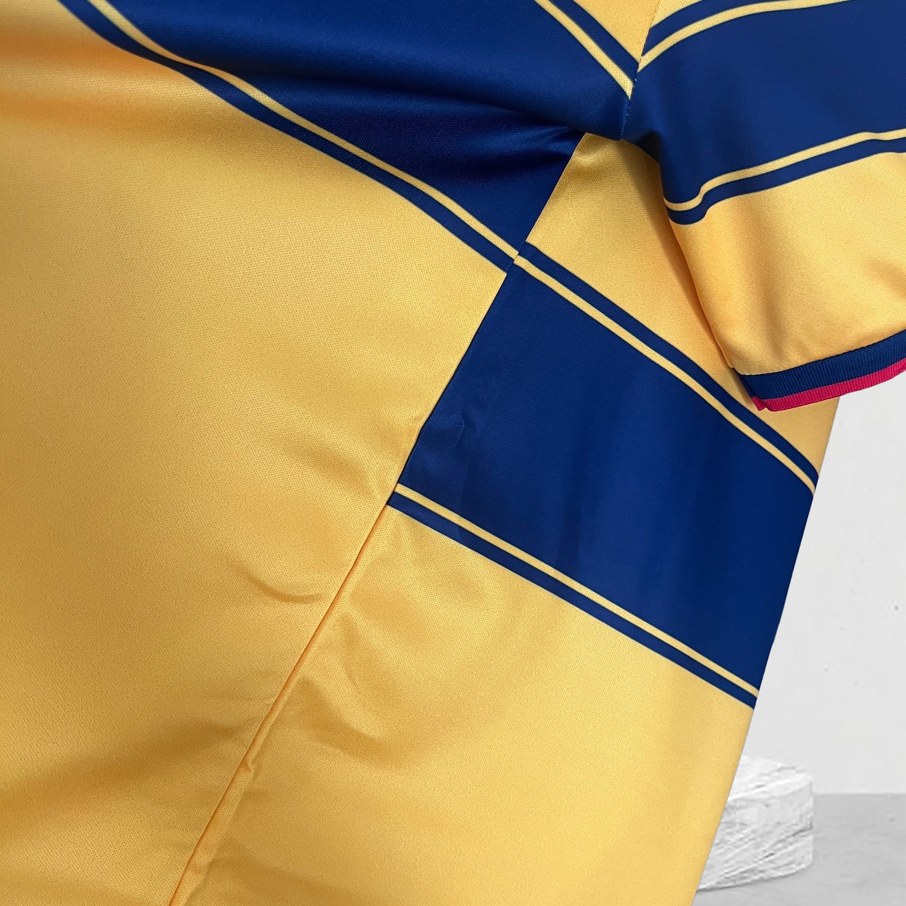 • Kragen: Blauer V-Ausschnitt mit rotem Streifen – typisches 90er-Design mit Retro-Charme