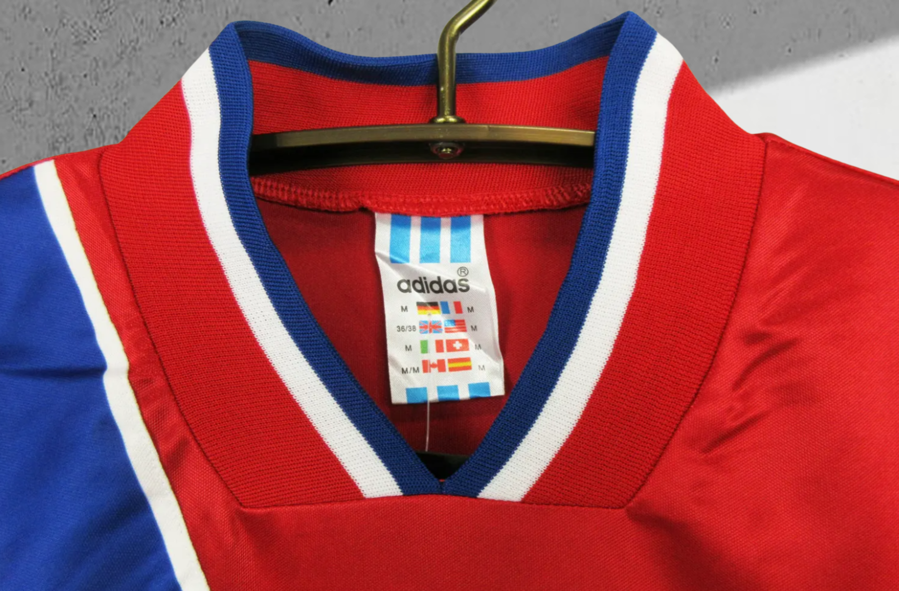 • Details: Breiter, quer verlaufender blauer Streifen mit weißen Rändern über der Brust – ein unverkennbares 90er-Design.
