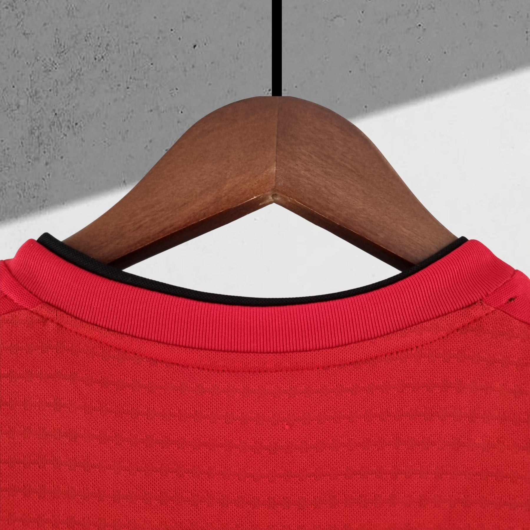 • Hauptfarbe: Traditionelles Rot mit fließendem Übergang zu Schwarz im unteren Bereich des Trikots.